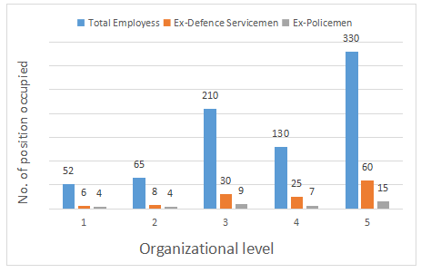 Five years ago Maxam Glass Co. had estimated its staff requirements in the five levels in their organization as: Level - 1: 55; Level - 2: 65; Level - 3: 225 ; Level - 4: 255 & Level - 5: 300. Over the years the company had recruited people based on ad-hoc requirements, in the process also selecting ex-defence service men and ex -policemen. The following graph shows actual staff strength at various levels as on date.