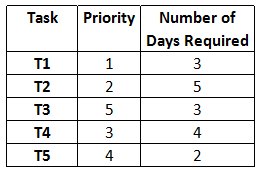 Arun has to go to the country of Ten to work on a series of tasks for which he must get a permit from the Government of Ten. Once the permit is issued, Arun can enter the country within ten days of the date of issuance of the permit. Once Arun enters Ten, he can stay for a maximum of ten days. Each of the tasks has a priority, and takes a certain number of days to complete. Arun cannot work on more than one task at a time. The following table gives the details of the priority and the number of days required for each task.