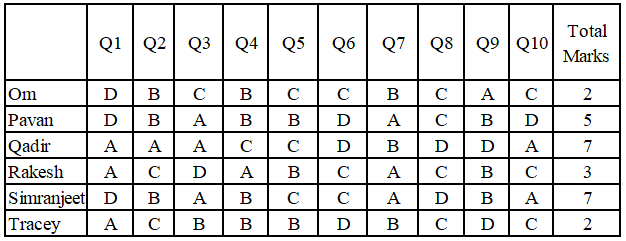 An examination had ten multiple choice questions; labelled Q1 to Q10 respectively. Each question had four answer options — A, B, C and D — of which one and only one was the correct answer. For each correct answer, the candidate obtained 1 mark. There were no negative marks for wrong answers. The answers chosen by six candidates named Om, Pavan, Qadir, Rakesh, Simranjeet and Tracey to each of the ten questions and the total marks obtained by each of them are shown in the table.
