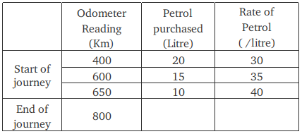 Ramya, based in Shanpur, took her car for a 400 km trip to Rampur. She maintained a log of the odometer readings and the amount of petrol she purchased at different petrol pumps at different prices (given below). Her car already had 10 litres of petrol at the start of the journey, and she first purchased petrol at the start of the journey, as given in table below, and she had 5 litres remaining at the end of the journey.