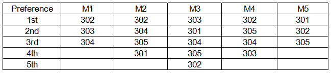 Alex Company has its office at the third floor of a multi - storied building in Mumbai. There are 5 rooms to be allotted to 5 managers (designated M1 to M5), each of whom will occupy one room. Each room has its own advantages and disadvantages. Some have the sea view, while others are closer to either the lift or the dining room, while some are more spacious. Each of the five managers was asked to rank the room preferences amongst the rooms 301, 302, 303, 304 and 305. Their preferences were recorded as follows: