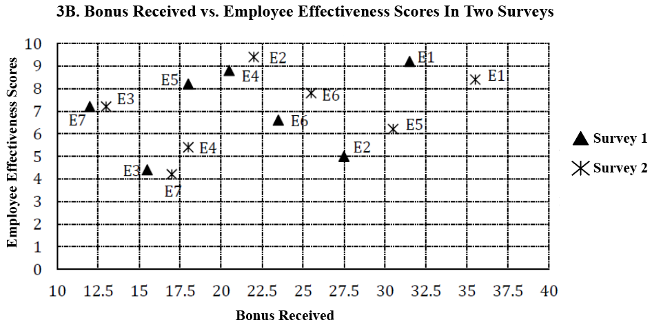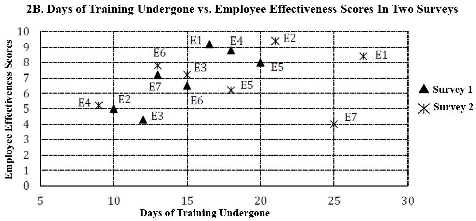 As a part of employee improvement programs, every year an organization conducts a survey on three factors: 1. Number of days (in integers) of training undergone, 2. Amount of bonus (in lacs) received by an employee and 3. Employee effectiveness score (on the scale of 1 to 10). Survey results for last two years are given below for the same seven employees.