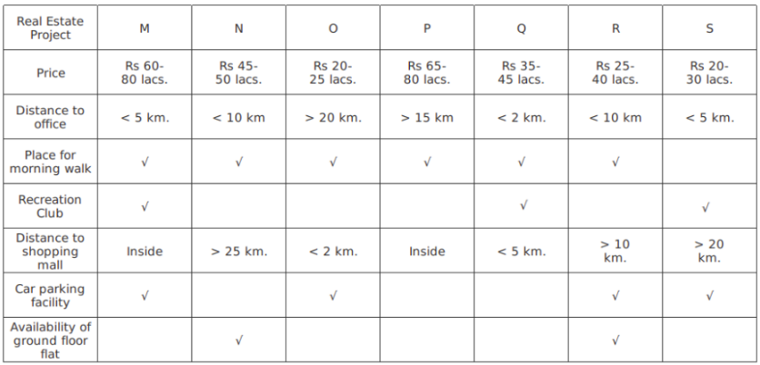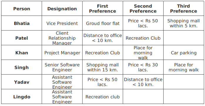 Six people working at the Bengaluru office of Simsys are planning to buy flats at a real estate project at Whitefield. Their preferences are listed below: