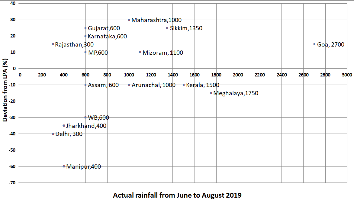 If a ‘Low Monsoon State’ is defined as a state with actual rainfall from June-August, 2019 of 750 mm or less, then what is the median ‘deviation from LPA’ (as defined in the Y-axis of the figure) of ‘Low Monsoon States’?