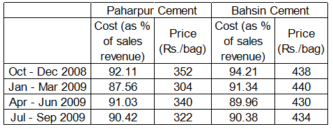 Cost and price data for Portland cement manufactured by Paharpur Cement and Bahsin Cement, for four consecutive quarters, are given in table 2: