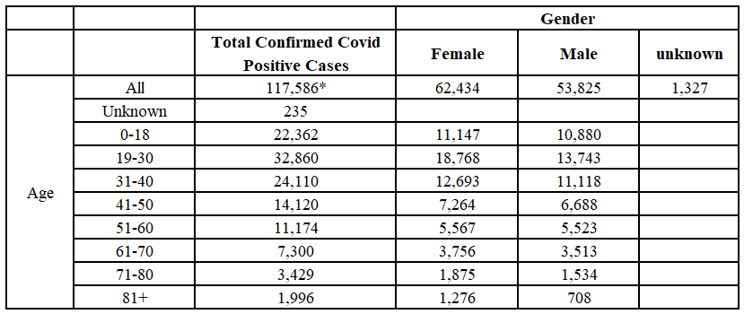 *Includes <5 cases in age group 19-30 and 51 -60 who reported gender as Other/Transgender. * In unknown age category, the ratio of males (unknown age category) and females (unknown age catego1y) to total unknown cases (unknown age category) is same as the ratio of males (All) and females (All) to the total (Total Confirmed Covid Positive Cases).