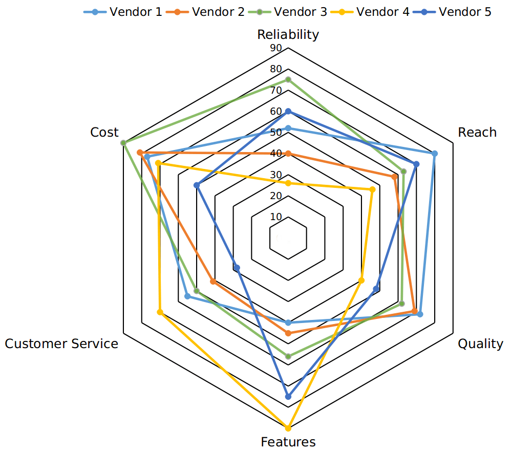 Five vendors are being considered for a service. The evaluation committee evaluated each vendor on six aspects - Cost, Customer Service,Features, Quality, Reach, and Reliability. Each of these evaluations are on a scale of 0 (worst) to 100 (perfect). The evaluation scores on these aspects are shown in the radar chart. For example, Vendor 1 obtains a score of 52 on Reliability, Vendor 2 obtains a score of 45 on Features and Vendor 3 obtains a score of 90 on Cost.