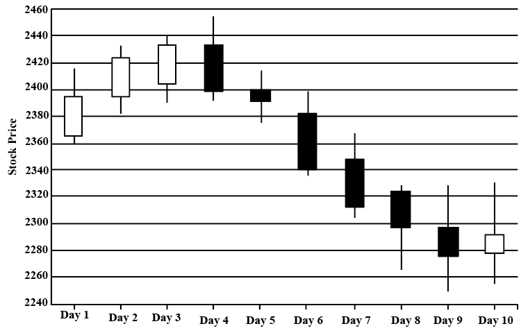 The given candlestick chart depicts the prices of a particular stock over 10 consecutive days. A candlestick comprises of a rectangular box pieced by a line. The top and bottom ends of the line respectively indicate the maximum and minimum prices of the stock on that day, while the horizontal edges of the rectangle correspond to the stock's opening and closing prices. If the rectangle is white, the opening price is lower than the closing price, but if the rectangle is black, then it is the other way around.