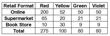 Red, Yellow, Green and Violet costs are allocated to different retail formats. These costs are apportioned in the ratio of number of units consumed by each retail format. The number of units consumed by each retail format is given in the table below: