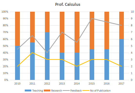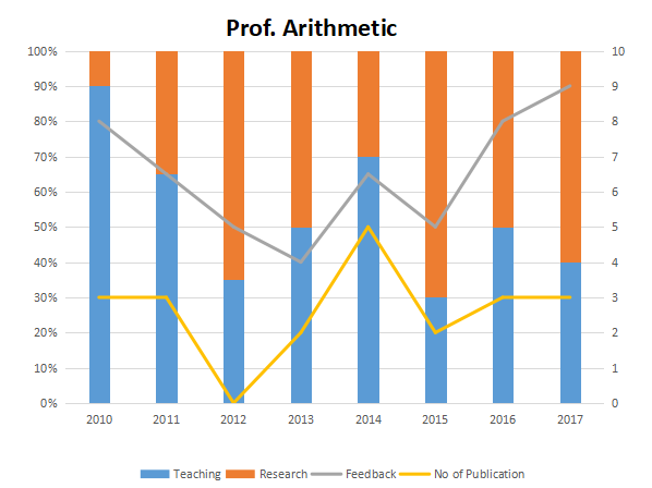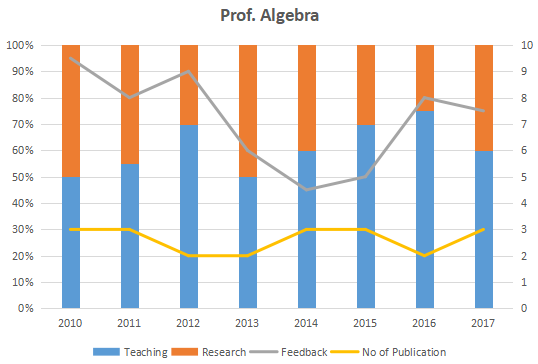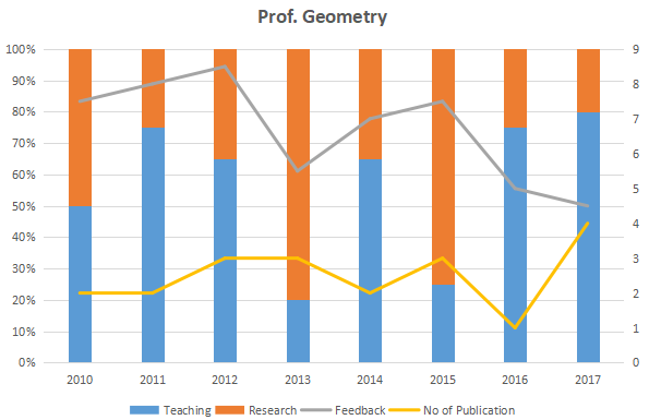 The graph below represent the performance of four professors, across years. measured on four variables: Percentage of time spent on research, teaching, feedback on (a scale of 10. right-hand side) and number of publications (right-hand side). Assume that the cumulative time spent per year on research and teaching activities are sane for all four professors and each of them taught only one course of 90 classroom hours.