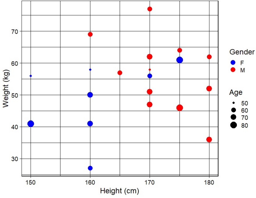 The following plot describes the height (in cm), weight (in kg), age (in years) and gender (F for female, M for male) of 20 patients visiting a hospital.