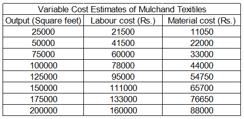 Apart from labour and material costs Mulchand Textiles incurs administrative costs of Rs. 40,000 per month, and electricity costs. Mr. Sharma recalled that estimate data of variable electricity cost had certain peculiar characteristics. Values at every 25000 sq ft of output increased in geometric progression till 150000 sq ft of output, after which values increased in arithmetic progression for every 25000 sq ft of output. Mr. Sharma remembered that the electricity cost was estimated to be Rs. 3800 for 25000 sq.ft. of output, Rs. 5700 for 50000 square feet of output and Rs. 38856.50 for 175000 square feet of output.