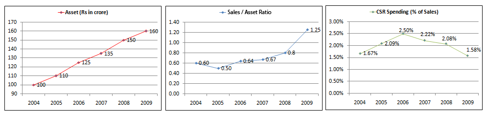 The following graphs give annual data of Assets, Sales (as percentage of Assets) and Spending on Corporate Social Responsibility (CSR) (as percentage of Sales), of a company for the period 2004 - 2009.