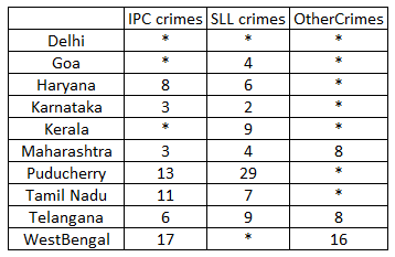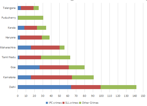 The number of cases - classified into three categories: IPC crimes, SLL crimes and other crimes - for nine states/UTs are shown in the figure below. These nine belong to the top ten states/UTs in terms of the total number of cases registered. The remaining state (among top ten) is West Bengal, where all the 520 cases registered were SLL crimes.