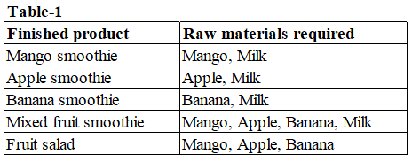 Ganga, Kaveri, and Narmada are three women who buy four raw materials (Mango, Apple, Banana and Milk) and sell five finished products (Mango smoothie, Apple smoothie, Banana smoothie, Mixed fruit smoothie and Fruit salad). Table-1 gives information about the raw materials required to produce the five finished products. One unit of a finished product requires one unit of each of the raw materials mentioned in the second column of the table.