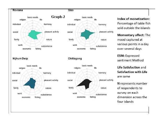 Go through the information given below, and answer the THREE questions that follow.Comprehension:The three graphs below capture relationship between economic (and social) activities and subjective well-being. The first graph (Graph-1) captures relationship between GDP (percapita) and Satisfaction with life, across different countries and four islands: Gizo, Roviana, Niijhum Dwip, and Chittagong. The Graph-2 captures three different measures of subjective well-being (Satisfaction with life, Affect Balance and Momentary Affect) across the four islands, which have different levels monetization (Index). The Graph-3 captures levels of thirteen different socio-economic activities across four islands.