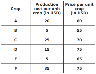 Geetha Gawde can cultivate up to 6 crops a year. Crop A and B are ready for harvest in 2 months; crop C and D in 3 months, and crop E and F in 4 months. Crop A can be cultivated from January to June; crop B can be cultivated from April to September; crop C can be cultivated from May to December; crops D as well as E can be cultivated from August to December, and crop F from November to May. If Geetha plans a change of crop the soil should be left fallow for one month; however, if the same crop is sown no fallow time is needed. Sowing takes place only at the beginning of a month. Geetha can only harvest a maximum of 1000 units of any crop at any point in time. The production cost per unit (incurred at the time of sowing) and price per unit of crop are as follows: