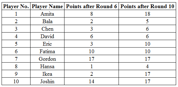 Ten players, as listed in the table below, participated in a rifle shooting competition comprising of 10 rounds. Each round had 6 participants. Players numbered 1 through 6 participated in Round 1, players 2 through 7 in Round 2,..., players 5 through 10 in Round 5, players 6 through 10 and 1 in Round 6, players 7 through 10, 1 and 2 in Round 7 and so on. The top three performances in each round were awarded 7, 3 and 1 points respectively. There were no ties in any of the 10 rounds. The table below gives the total number of points obtained by the 10 players after Round 6 and Round 10.